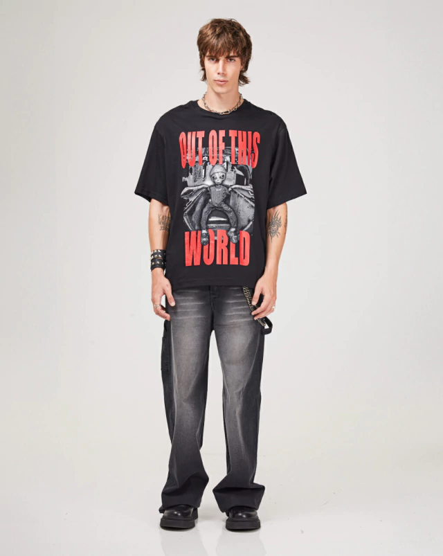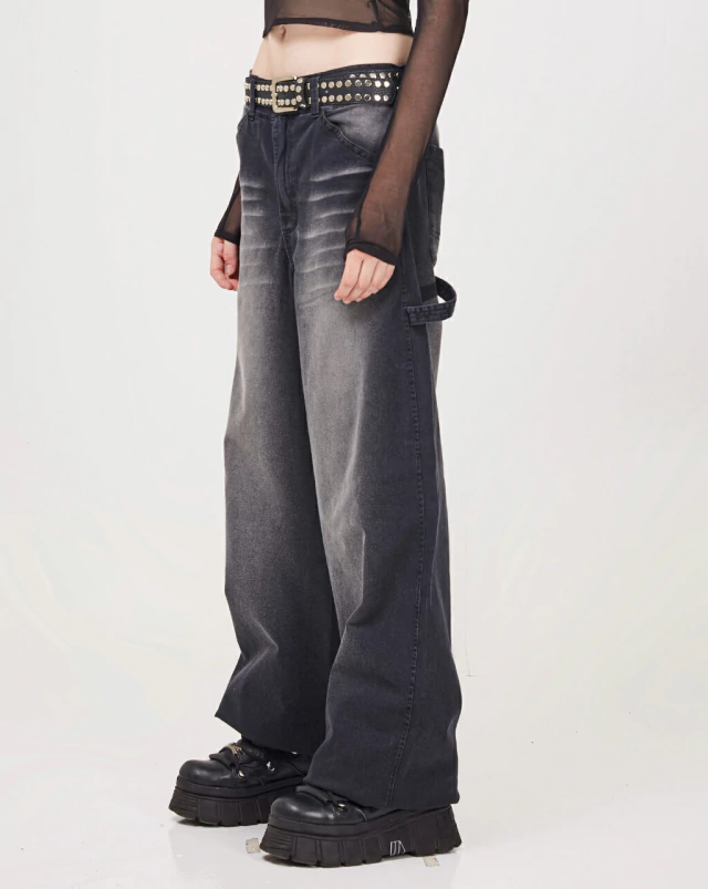 Pantalón carpintero de pierna ancha con localizado y lavado artesanal.