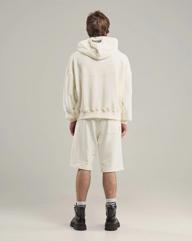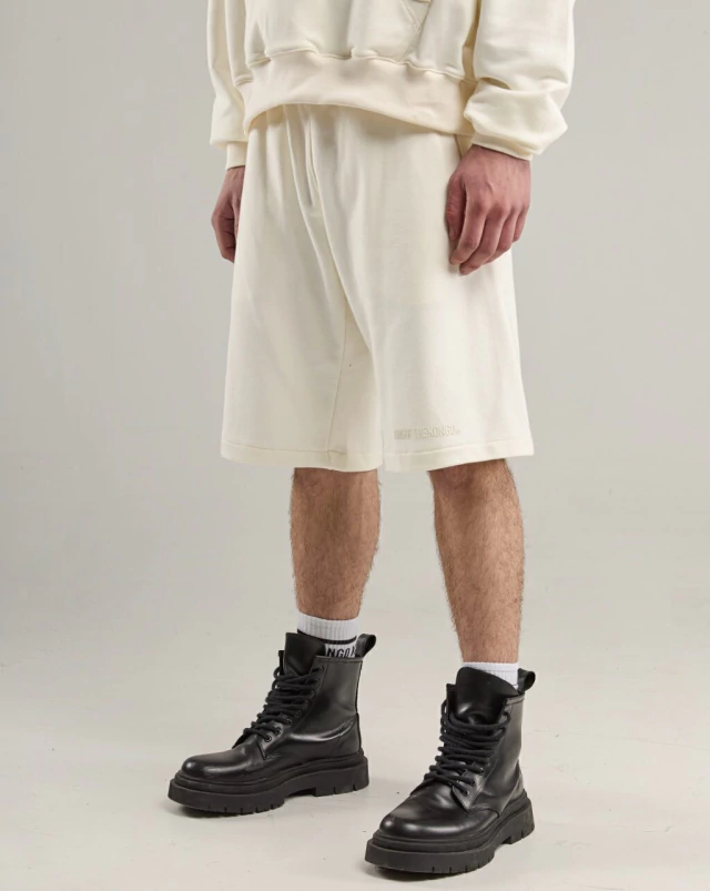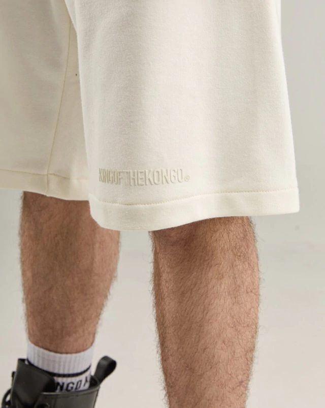 Bermuda color off white, de corte relajado y amplio a la rodilla.