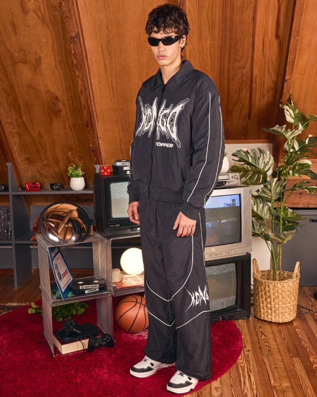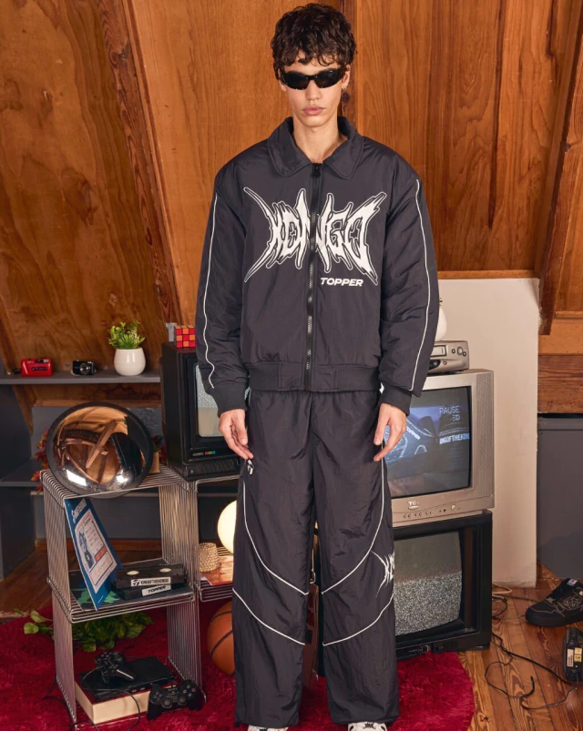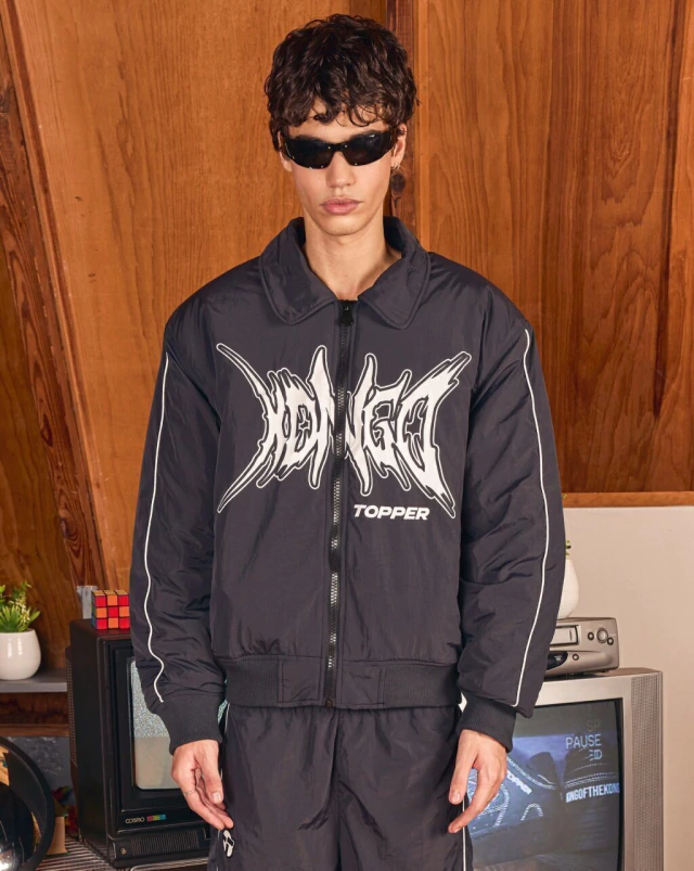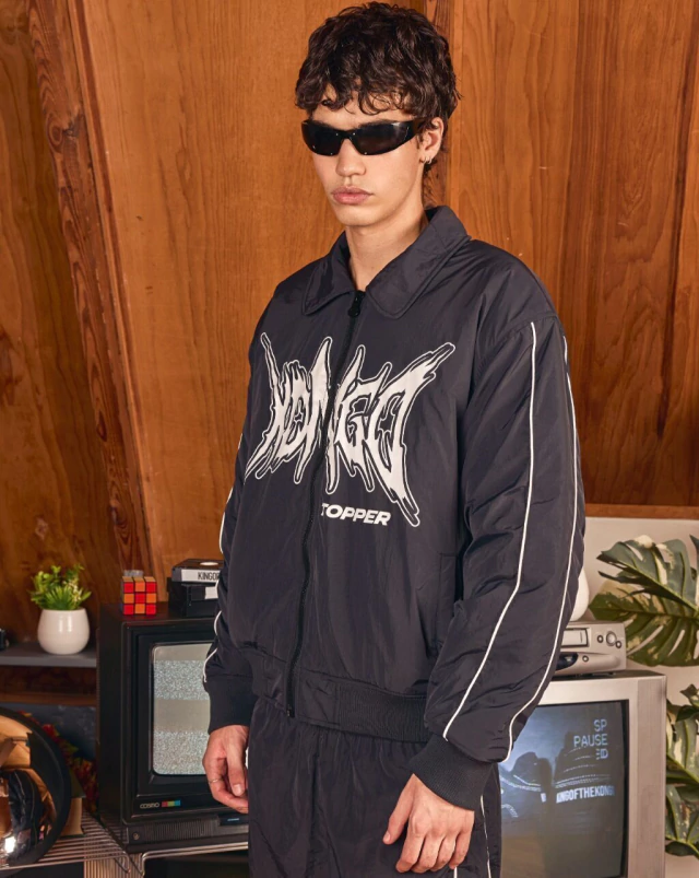 Recorte en manga con vivos a contratono. Forrería personalizada de la línea. Cierre plástico con tiracierre personalizado. Bolsillos ojal. Arte de la colaboración oversize en pecho.