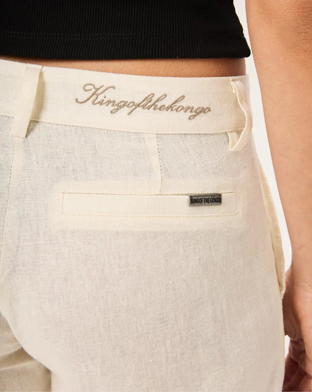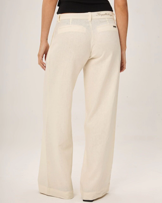 Pantalón con lino de pierna ancha y pinzas en el frente. Cintura trasera con presencia de marca bordada.